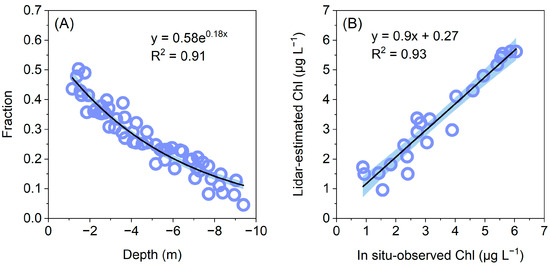 Figure 4. Results of regression analysis of (A) fractions at different depths and (B) lidar-estimated and in-situ-observed chlorophyll-a concentrations.