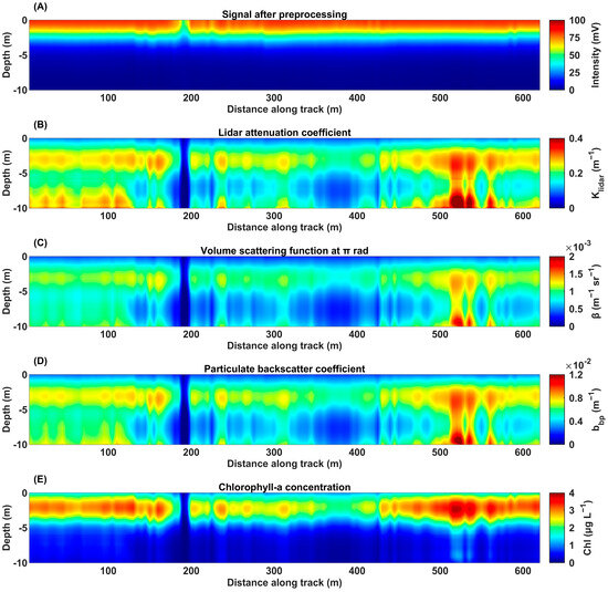 Figure 5. Step-by-step example of a lidar inversion along the lidar track. Vertical profile distributions of (A) signal after preprocessing, (B) lidar attenuation coefficient, (C) lidar volume scattering function at a scattering angle of π rad, (D) particulate backscatter coefficient, and (E) chlorophyll-a concentration.