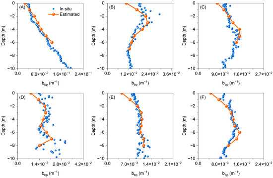 Figure 6. Comparisons of vertical profiles between lidar-estimated and in-situ-observed bbp values at (A) S1, (B) S2, (C) S3, (D) S4, (E) S5, and (F) S6. Yellow dots are lidar estimations and blue dots are in situ observations.