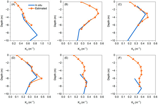 Figure 7. Comparisons of vertical profiles between lidar-estimated and in-situ-observed Kd values at (A) S1, (B) S2, (C) S3, (D) S4, (E) S5, and (F) S6. Yellow dots are lidar estimations and blue dots are in situ observations.