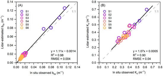 Figure 8. Scatter plots of regression analysis results between lidar-estimated and in-situ-observed (A) bbp and (B) Kd profiles for stations 1–6. The solid line is the linear regression.