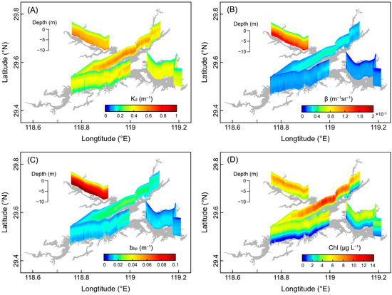 Figure 9. Three-dimensional profile distributions of (A) diffusion attenuation coefficient, (B) lidar volume scattering function at a scattering angle of π rad, (C) particulate backscatter coefficient, and (D) chlorophyll-a concentration estimated from the lidar data obtained during the 2019 cruise in Qiandao Lake.