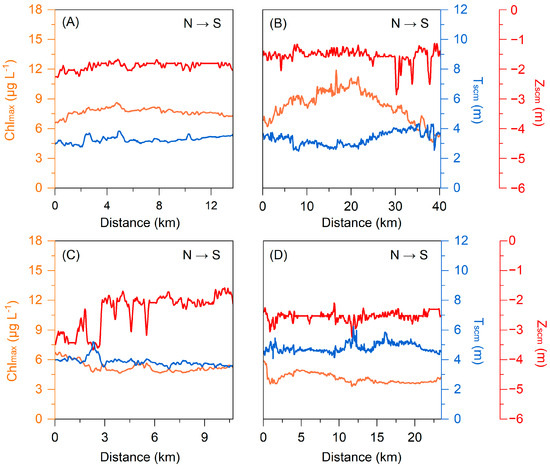 Figure 10. The distributions of SCM maximum depth (Zscm), SCM thickness (Tscm), and maximum value of chlorophyll-a concentration (Chlmax) along (A) Track 1, (B) Track 2, (C) Track 3, and (D) Track 4. All lidar tracks are plotted from north to south.