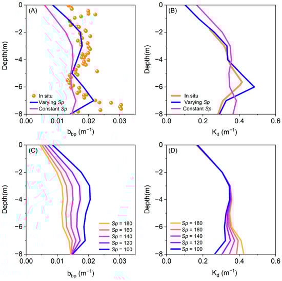 Figure 11. The influence of setting different Sp(z) values. (A,B) Inversion results of bbp and Kd under constant and depth-varying lidar ratios. (C,D) bbp and Kd values obtained by setting different values of the constant Sp(z).