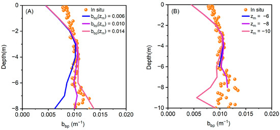 Figure 12. Comparison between lidar-estimated particulate backscatter coefficient with (A) different bbp(zm) values and (B) different zm values.