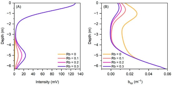 Figure 13. (A) Simulated echo signals with different reflectance of the bottom (Rb) and (B) the inversed value of the particulate backscatter coefficient.