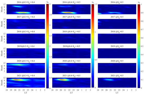 Figure 3 illustrates that the occurrence rates of scintillations in Sanya are significantly higher in 2016, 2020, and 2021 compared to 2017–2019. In 2016, a pronounced equinoctial asymmetry is observed, with the highest incidence of scintillations noted during the spring equinox. In 2020 and 2021, scintillations are predominantly concentrated around the autumnal equinox. The occurrence of scintillations spans a broader range of months and LTs, and its intensity is greater in the autumn of 2021 than in that of 2020. In the autumns of 2016, 2020, and 2021, the occurrence rates of scintillations decrease gradually with increasing scintillation intensity and even disappear at higher intensities. In 2016, the ionospheric scintillations in Sanya exhibit a distinct characteristic compared to other years: a strong scintillation is observed before sunset in February 2016.