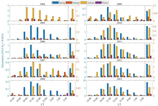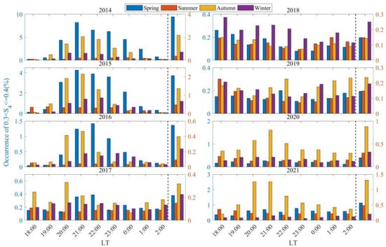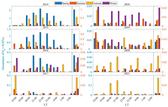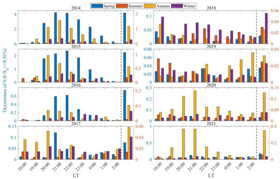 While the occurrence rates of scintillations are modulated by solar activity, season and LT also play crucial roles. Figure 5 and Figure 6 present the distribution of weak scintillation occurrence rates in Sanya, by season and LT, for the periods 2004 to 2013 and 2014 to 2021, respectively. The left side of the dashed line in the figures represents the distribution of weak scintillation occurrences in Sanya from 18:00 LT to 02:00 the following day during different seasons, and the right side of the dashed line shows the distribution of the average values of weak scintillation occurrences in Sanya during the corresponding time periods. From the left side of the dashed line in Figure 5, it can be found that weak scintillations in Sanya during 2004–2013 mainly occur from 19:30 to 23:30 LT. The occurrence rate of weak scintillations begins to increase from 19:30 to 20:30 LT, reaches its peak between 20:30 and 22:30 LT, and then significantly decreases after midnight. The peak occurrence rate of weak scintillations is primarily concentrated around 21:00 LT [27,37]. The duration of weak scintillations in Sanya varies across different seasons, with the longest duration occurring in spring [22,41]. From the left side of the dashed line in Figure 6, it can be observed that the local distribution of weak scintillation occurrence rates before midnight in Sanya from 2004 to 2013 is largely consistent with that during the high solar activity years (2014–2015) and some low solar activity years (2016, 2020–2021). During some low solar activity years (2017–2019), due to the overall low occurrence rate of weak scintillations, there is no significant difference in the occurrence rate of weak scintillations at different LTs [2].