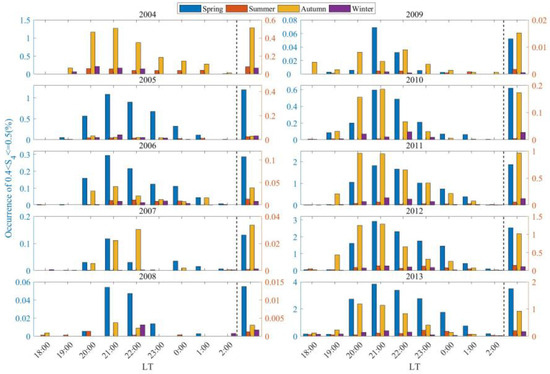 Figure 7 and Figure 8, respectively, illustrate the distribution of moderate scintillation occurrence rates in Sanya from 2004 to 2013 and from 2014 to 2021, as a function of season and LT. Figure 9 and Figure 10 present the corresponding distributions for strong scintillations. The left side of the dashed line in these figures represents the distribution of moderate or strong scintillation occurrences in Sanya from 18:00 to 02:00 LT the following day during different seasons, while the right side of the dashed line indicates the distribution of the average values of moderate or strong scintillation occurrences in Sanya during the corresponding time periods. From the left side of the dashed line in Figure 7 and Figure 8, it can be seen that the distribution of moderate scintillation occurrences with LT in Sanya from 2004 to 2021 follows the same pattern as that of weak scintillations in Sanya during the same period, as shown in Figure 5 and Figure 6. From the left side of the dashed line in Figure 9 and Figure 10, it can be observed that in the spring of 2009, the occurrence rate of strong scintillations in Sanya reaches its peak around 23:00 LT, which is later than the occurrence rates of weak and moderate scintillations that reach their peaks at 21:00 LT. Additionally, strong scintillation events in Sanya occur before 18:30 LT during the winter of 2016 and the autumn of 2017.