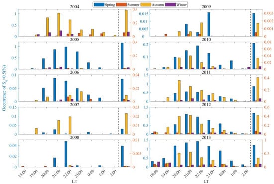 As shown in Figure 2, the occurrence rates of scintillations are highest in 2014, the year with the strongest solar activity, and are concentrated around the spring and autumn equinoxes. In 2013 and 2014, the occurrence rates of scintillations exhibit a pronounced equinoctial asymmetry, characterized by a significantly higher rate in spring than in autumn. In the spring of 2011 and in the autumn of 2013 and 2015, the occurrence rates of scintillations decrease as the scintillation intensity increases. In contrast, in the autumn of 2011 and in the spring of 2013 and 2015, there is no significant change in the occurrence rates with the enhancement of scintillation intensity. Additionally, in 2011, 2012, and 2015, scintillations in the autumn occur about one hour earlier than those in the spring.