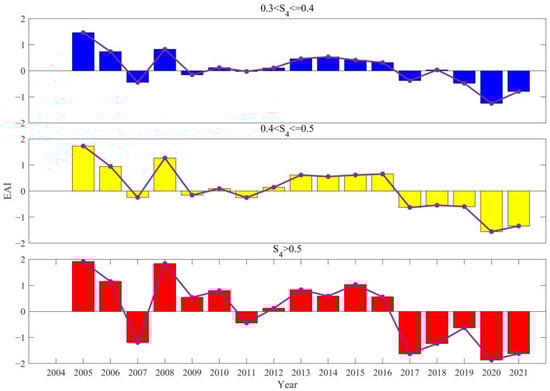 The distribution of the EAI for different intensities of scintillations in Sanya from 2004 to 2021.
