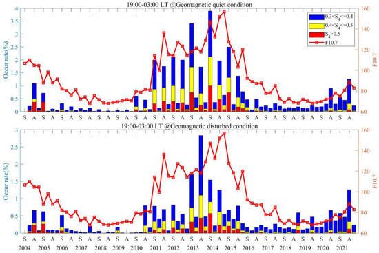 In order to comprehensively analyze the impact of geomagnetic activity on the occurrence rates of scintillations of different intensities, Figure 12 presents the distribution of the occurrence rates of scintillations of different intensities in Sanya under different geomagnetic activity conditions from 2004 to 2021, during the LT from 19:00 to 03:00 of the next day. The upper and lower subplots in the figure, respectively, present the distribution of ionospheric scintillations under geomagnetic quiet and disturbed conditions. Different colors represent the occurrence rates of different scintillation intensities: blue represents the occurrence rate of weak scintillations, yellow represents the occurrence rate of moderate scintillations, and red represents the occurrence rate of strong scintillations. At the same time, we use the letter S to represent spring and the letter A to represent autumn. From the figure, it can be found that the occurrence rates of ionospheric scintillations under disturbed magnetic conditions are generally lower than those under quiet conditions. This result indicates that geomagnetic disturbances generally inhibit the occurrence of scintillations. Meanwhile, geomagnetic disturbances show a significant promoting effect on ionospheric scintillations in Sanya during the spring of 2006, the summer of 2011, the autumn and winter of 2013, and the winter of 2018.