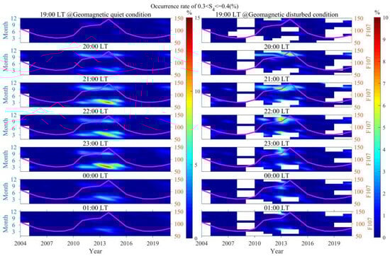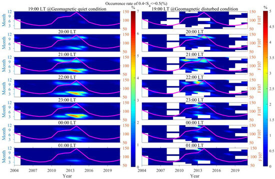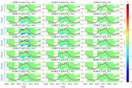 In order to better reflect the distribution characteristics of different intensity scintillations in relation to solar activity, season, LT, and geomagnetic activity, based on the S4 index, scintillation intensity is classified into three categories: weak scintillation (0.3 < S4 ≤ 0.4), moderate scintillation (0.4 < S4 ≤ 0.5), and strong scintillation (S4 > 0.5) [16]. Furthermore, the occurrence rates of scintillation at a given moment are defined as the ratio of the number of data points within the ranges of weak, moderate, and strong scintillations to the total number of observed data points within 30 min before and after that moment [17,40].