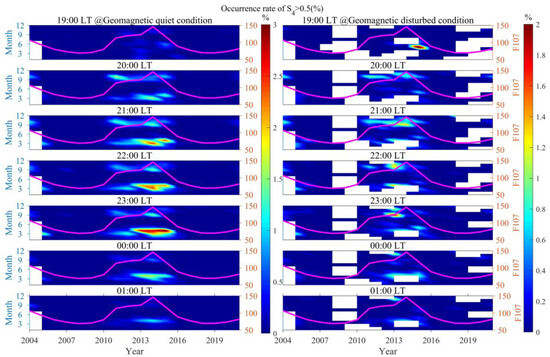 Figure 5, Figure 6, Figure 7, Figure 8, Figure 9 and Figure 10 show that scintillations in Sanya mainly occur from 19:30 to 23:30 LT during the period from 2004 to 2021. The LT characteristics of scintillations in Sanya are more closely related to the occurrence and disappearance times of the polarized electric field. Abdu et al. [54] pointed out that the eastward thermosphere zonal wind at dusk can generate a vertical polarization electric field in the F-layer. The decay of the E-layer conductivity at night leads to an increase in the longitudinal gradient, which in turn increases the linear growth rate of the Rayleigh–Taylor (R-T) instability. A large number of studies suggest that R-T instability is responsible for promoting the generation of irregularities [27,49,50]. Therefore, the polarized electric field generated at dusk indirectly promotes the occurrence of ionospheric scintillations in Sanya around dusk. After midnight, the polarization electric field generated in the F-layer is weakened due to the decrease in the electron density of the F-layer, which leads to a lower occurrence rate of scintillation after midnight compared to before midnight.