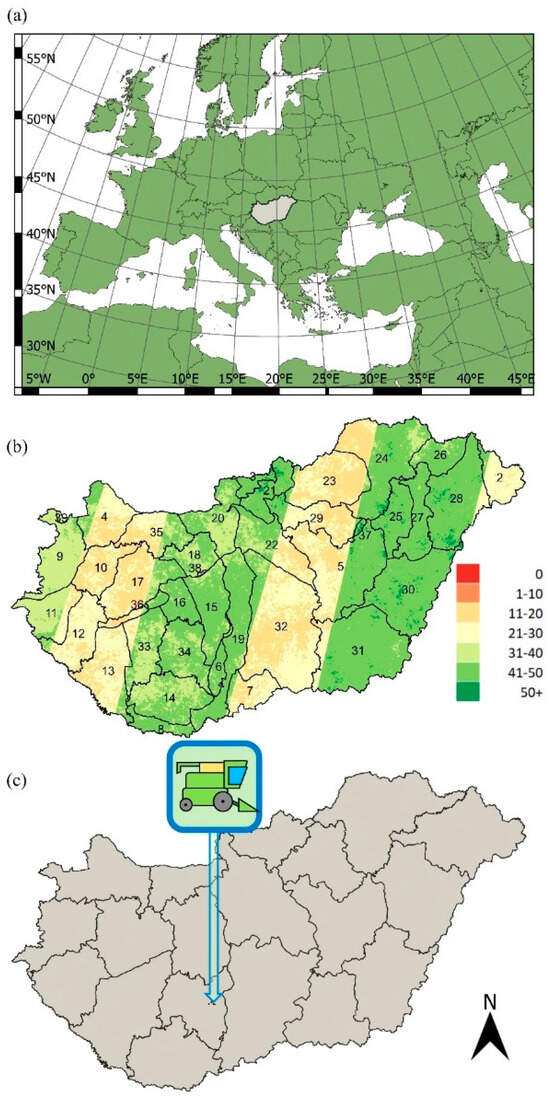 Spatial characteristics of the study area and visual representation of the applied datasets: (a) location of Hungary in Central Europe; (b) number of cloud-free Sentinel-2 observations available between May and October, with the contours of agroecological zones; (c) location of study parcels with harvester-derived precision yield data and county borders within the country.