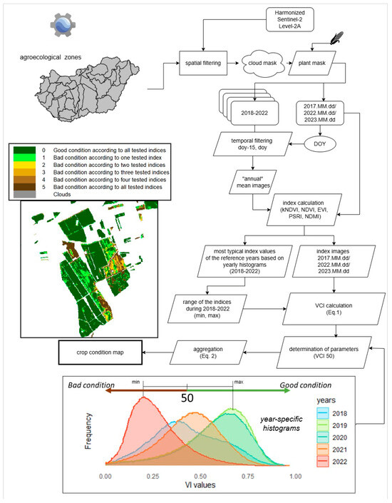 To facilitate analysis and comparison, we normalised and categorised the aforementioned indices separately using the Vegetation Condition Index (VCI) approach [37]. Normalisation was conducted according to the formula (VIi,j − VImin)/(VImax − VImin) × 100, resulting in values expressed in percentage. Although the normalisation of a given VI is usually performed either on a pixel basis or over the entire dataset, we chose a different approach specific to the acquisition time and agroecological zone (see details in Section 2.4). The VCI approach is beneficial for making relative assessments, such as detecting pixel-specific changes in the VI signal, as it reduces the effect of local geographic and environmental factors on the spatial variability of a VI. In the literature, the VCI is, in most cases, calculated from the NDVI; hence, previous findings on the reliability of the approach apply to this index. The NDVI-based VCI allows for more accurate comparisons across various ecological zones and vegetation types, and it serves as a more effective indicator of vegetation stress conditions than the NDVI alone. The VCI is considered more reliable than other indices for monitoring drought in arid and semi-arid regions [38]. According to the proposed approach, a VCI value above 50% reflects relatively good vegetation conditions (under ideal conditions, the VCI approaches 100%). The study of Belal et al. [39] also shows that the VCI values have stronger correlations with precipitation than that of the NDVI, as local factors, such as soil characteristics, previous year’s stress, and land cover, also influence the vegetation state.