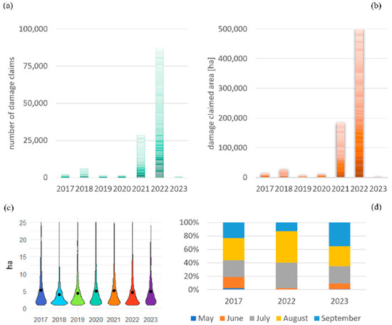 Damage claim statistics in Hungary by year during the study period of 2017–2023: (a) number of damage claims for maize; (b) total area of maize damage claims by year in the relevant years of the research; (c) distribution of the areas of claimed parcels in different years (larger than 1 ha); (d) percentage of claims per month of submission for the studied years.