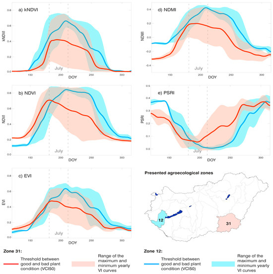 Characteristic maize-specific VI profiles from two contrasting agroecological zones in Hungary (zones 12 and 31; see Figure 1b for zone definitions) based on the selected vegetation indices for the time period of 2018–2022: (a) kNDVI; (b) NDVI; (c) EVI; (d) NDMI; (e) PSRI. Red colours represent one of the most drought-affected, while blue indicates one of the least drought-affected regions in the country. The range of vegetation indices from the reference years’ maximum and minimum mode (peak values of the year-specific histograms) time series are shown on the graphs, and the thick lines (termed here as VCI50) represent the boundaries of the good (VCI above 50) and bad (VCI below 50) conditions during the growing season of maize, except for the PSRI, for which the thresholds are opposite (see Figure S4 in the Supplement). The dashed vertical lines indicate July. Smoothing was applied to the figure to facilitate easy interpretation of the profiles.