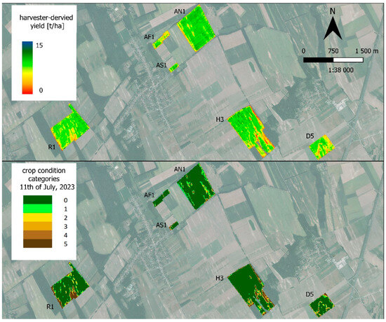 High-resolution, harvester-derived maize yield data for the six reference parcels on the Sentinel-2 grid (above) and the calculated six-category crop condition map (below) for the six reference parcels located in Tolna County. The colours represent the crop condition according to the legend (0 is the best; 5 is the worst category).