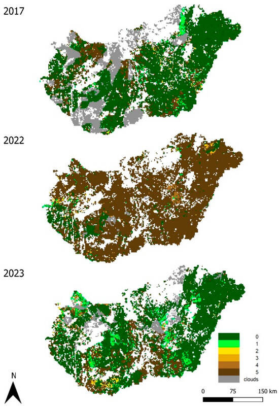Aggregated crop condition categories for July for the 3 study years (2017, 2022, and 2023). The spatial resolution of the aggregation is 2 km. The colours of the maps represent the crop condition according to the legend (0 is the best; 5 is the worst category). The grey colour represents missing data, while the white colour indicates the areas where maize was not present in the given year.
