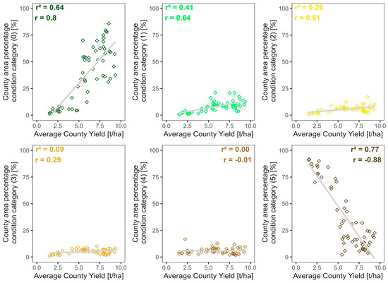 Some of the area percentages of the maize condition categories aggregated to the county level show good correlations with the county average yield values of the given areas and years in the three years examined (Figure 7). For the best crop condition, the explained variance was 64% when all years and counties were considered together. In the case of the worst crop category (5), the explained variance was 77%. As expected, the direction of the positive correlation of the best category with respect to yield gradually turned in a negative direction towards the worse categories. The covariance between the yield and the county area share of the category was low for the intermediate categories. To assess the potential effects of cloud cover on the mapping process, we correlated the error of the category 5 linear model with the county cloud cover values and found no correlation (Figure S5), implying no significant distorting effects.