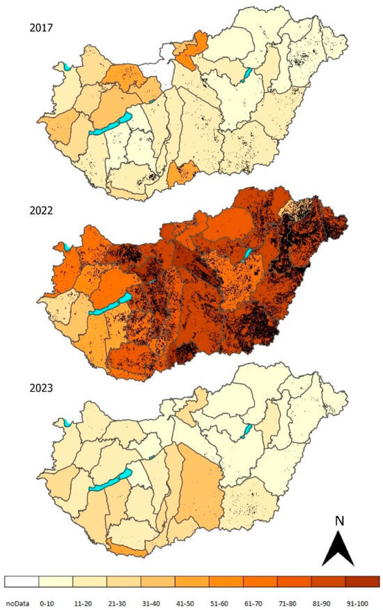 Figure 6 shows the aggregated, pixel-level crop condition map for July for the three study years (2017, 2022, and 2023). The raw, pixel-based data were aggregated to 2 km for better visualisation. For the aggregation, the data content was defined as the majority category value of the crop condition within the 2 km grid cell.