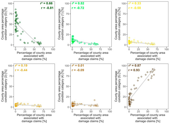 Correlation of the percentage of county area of a given crop condition in July with county yields based on 3 years (2017, 2022, and 2023) of data for the whole country based on NUTS3-level maize yield data. The six panels represent the six crop condition categories (from best to worst).
