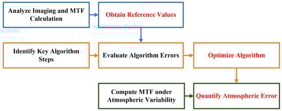 Atmospheric scattering and absorption MTF cannot be measured directly and there is no completely standard method for calculating this. In order to investigate the influence of atmospheric scattering and absorption on the measurement of high-resolution optical satellites on-orbit MTF, the MTFs of satellite images with different atmospheric conditions were compared with the MTFs of atmospheric corrected images to achieve the estimation and analysis of atmospheric MTF. Firstly, based on the sensor parameters of the GF-2 satellite and the principle of the optical imaging system, the theoretical MTF of the GF-2 satellite at Nyquist frequency was obtained. Secondly, taking the theoretical MTF as a reference, the impact of different error terms in key steps of the slanted-edge method on the MTF results was analyzed and evaluated. In this way, the optimal robust MTF calculation process was determined. Finally, satellite images with different atmospheric conditions were simulated using a radiative transfer model based on the atmospheric corrected satellite image, and the MTFs of different images were calculated using the optimal MTF calculation process to further estimate the influence of atmospheric scattering and absorption MTF. The specific flow is shown in Figure 2.