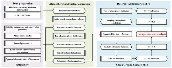 To quantitatively calculate the impact of atmosphere on the on-orbit MTF of high-resolution optical imaging satellite, the atmosphere is regarded as a whole system, with ground radiation as the input signal and top-of-atmosphere (TOA) radiation as the output signal. Images of different atmospheric conditions are simulated using a radiative transfer model. The radiative transfer model used here is the Second Simulation of a Satellite Signal in the Solar Spectrum, Vector (6SV), an advanced RT code specifically designed to simulate the reflection of radiation by a coupled atmosphere–surface system. Its simulations are in fairly good agreement with those of Monte Carlo []. When used for simulations of satellite observations, the input parameters of the 6SV model include solar-view geometry, atmospheric model, aerosol model, aerosol optical depth, target elevation, spectral band and spectral response function, and anisotropic and Lambertian ground conditions. By comparing the MTF of simulated ground radiation and TOA radiation, i.e., the input signal and the output signal, the atmospheric scattering and absorption MTF can be obtained. The specific process is shown in Figure 3.