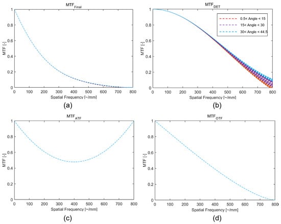 According to the linear system theory, the MTF of each part of the spaceborne optical remote sensor imaging chain can be cascaded; that is, in the frequency domain, the overall system’s MTF can be calculated by multiplying the atmospheric , the optical lens , the detector , and the electronic system []: