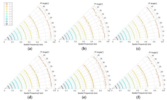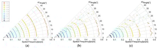 Figure 5 shows the variation in the MTF values obtained through edge detection using the Gaussian fitting method (Figure 5a), error fitting method (Figure 5b), and centroid detection method (Figure 5c) in the polar coordinate, within the frequency range of 0–0.6 lp/pix and the edge inclination range of 0.5–44.5°. Different colors represent different MTF values. It can be seen that as the angle increases, the MTF shows a significant downward trend, especially when it is greater than 15°. According to the results of the three detection methods, a low edge slant angle (approximately less than 3°) will result in insufficient sampling and the inability to calculate an effective MTF; while edge slant angles (approximately greater than 12°) that are too high may cause the signal to alias to some extent, resulting numerical hopping in the figure. Therefore, when calculating the MTF based on edge images, it is advisable to control the edge slant angle within a small angular range. In the small angle case, the Gaussian fitting method and error fitting method have high consistency, and the MTF values show a more synchronous robustness while the centroid detection method exhibits significantly more instability than the former two.