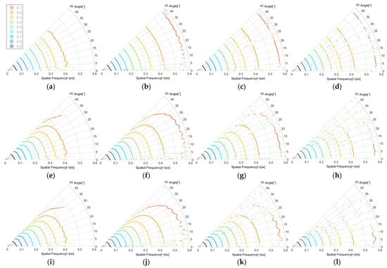 Figure 6 shows the distribution of different MTF values with oversampling rates and edge detection methods. The range of polar coordinates is the same as that shown in Figure 4, with a frequency axis range of 0–0.6 lp/pix and an edge inclination range of 0.5–44.5°. The four rows in the figure, from top to bottom, are the Gaussian fitting method, error fitting method, and centroid detection method. From left to right, the three columns are no oversampling, 2× oversampling, 4× oversampling, and 8× oversampling.