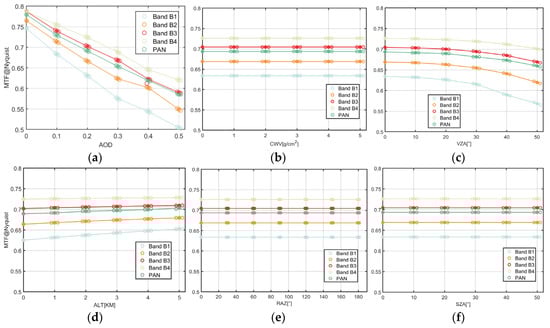 Group diagram of the results of atmospheric scattering and absorption MTF variations in various bands calculated based on satellite images, where (a) AOD, (b) CWV, (c) SZA, (d) ALT, (e) RAZ, and (f) SZA.