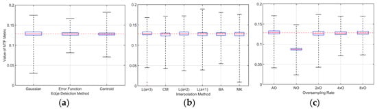 Figure 9a–c present the MTF value distribution of 1000 repeated experiments using different edge detection methods, oversampling rates, and interpolation methods, respectively. The solid line in the middle of the box plot represents the median MTF value, with the top and bottom indicating the first and third quartiles of the MTF value, respectively. The red dashed line at 0.1283 represents the theoretical value of . From the maximum and minimum values of the box plots, the dispersion of Gaussian method in Figure 9a, Lanczos (a = 3) method in Figure 9b, and adaptive oversampling rate in Figure 9c are all moderate compared to other methods. Despite being slightly affected by noise, their MTF medians are almost the same as the theoretical values, indicating that these methods are relatively more accurate.