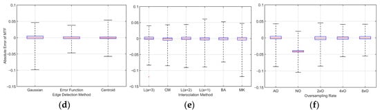 Figure 9d–f show the distribution of ΔMTF values for repeated experiments. In Figure 9d, the Gaussian fitting method shows an absolute error range from −0.0984 to 0.0464, with its median value closer to 0 than those obtained using the error fitting method and centroid detection method used for edge detection. When considering systematic errors, the error magnitude and distribution consistency of the Gaussian fitting method are more ideal. In Figure 9e, the Lanczos (a = 3) interpolation method has an average absolute error of −0.0001, which is closer to 0 than that obtained using other interpolation methods. The median is slightly negative-biased, but overall, the Lanczos (a = 3) interpolation method demonstrates the best performance in terms of measurement accuracy. In Figure 9f, the range of MTF results measured at different oversampling rates is relatively similar, with the largest variation and widest distribution observed for the 0× oversampling measurement values, spanning from −0.1045 to 0.0199. The average absolute error of the adaptive oversampling rate is nearly zero (0.0002), indicating the highest measurement accuracy among all methods. In comparison, the mean absolute errors for the 4× and 8× fixed oversampling rates are −0.0006 and −0.0003, respectively, with medians of −0.0009 and −0.0005. Although these fixed oversampling rates exhibit relatively low error magnitudes, they still fail to achieve the precision of the adaptive oversampling method. Furthermore, fixed oversampling rates slightly skew toward negative values and lack the dynamic adaptability of AO, making them prone to underperformance in more complex or non-uniform scenarios.