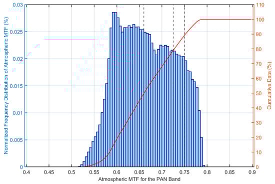 Histogram of the atmospheric scattering and absorption MTF for the PAN band, accompanied by a cumulative data curve. Three vertical black dashed lines indicate the positions at which the cumulative percentages reach 50%, 80%, and 90%, respectively.