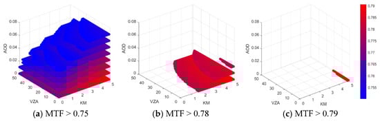 Figure 11 shows the recommended threshold ranges for AOD, VZA, and ALT when the atmospheric scattering and absorption MTF is higher than 0.75, 0.78, and 0.79 under the set analysis conditions. The selection of the three MTF values was mainly based on a statistical analysis of the cumulative percentage of atmospheric scattering and absorption MTF values for 132,651 data sets presented in Figure 10. The cumulative percentages corresponding to MTFs of 0.75, 0.78, and 0.79 were approximately 90%, 98%, and 100%, respectively. It can be seen that the impact of the three elements on atmospheric scattering and absorption MTF has a non-regular distribution. The results indicate that, to meet the requirements of an atmospheric scattering and absorption MTF better than 0.75, the threshold range of the three elements is relatively loose, with an AOD within 0–0.08, VZA within 0–50°, and ALT within 0–5 km. To meet the requirement of an atmospheric scattering and absorption MTF better than 0.78, there are strict threshold ranges for the three elements, with an AOD of less than 0.02, VZA within 0–50°, and ALT greater than 1.7 km. To meet the requirement of an atmospheric scattering and absorption MTF of better than 0.79, AOD needs to be close to 0, VZA needs to be less than 20°, and ALT needs to be greater than 4.9 km. Therefore, the on-orbit testing of satellites should be conducted at sites with as low an AOD and as high an altitude as possible, as well as using a small satellite zenith angle.