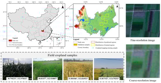 Accurate cropland mapping using remote sensing imagery is of great significance for precision agriculture [,]. In practice, although the use of fine-resolution imagery, such as Gaofen-2 (GF-2) [] and Worldview [], can achieve relatively precise results, they are often difficult to apply on a large scale due to limitations in the low temporal resolution and the high cost of satellite images. Currently, medium spatial resolution remote sensing images, especially those acquired by Landsat and Sentinel satellites, have become mainstream for cropland mapping due to their ease of access and extensive coverage [,,,]. However, these datasets also fall short of meeting the requirements for fine spatial resolution cropland mapping. In regions where cropland plots are relatively small or highly fragmented, these data fail to accurately extract cropland boundaries and often lead to the misclassification or omission of croplands. This issue arises mainly from the presence of mixed pixels, where both cropland and non-cropland types coexist within a single pixel []. As cropland fragmentation increases, the problem of mixed pixels becomes more severe, leading to inaccurate estimates of cropland areas, which in turn significantly affects agricultural management and planning [].