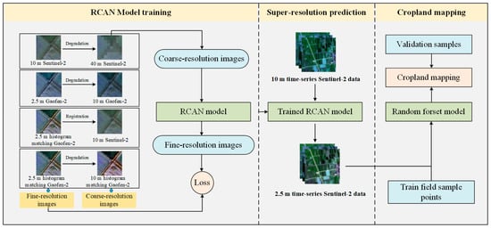 The object of the study is to use the 10-m Sentinel-2 data to map cropland with a spatial resolution of 2.5 m. The whole workflow consists of three stages, as illustrated in Figure 2. First, four different types of spatial super-resolution model training samples, including fine spatial resolution images and the corresponding coarse spatial resolution images, are generated. Second, a deep learning model is trained using these training samples, and the trained model is then applied to perform spatial super-resolution reconstruction on the Sentinel-2 time series, resulting in a series of fine spatial resolution images. Finally, the reconstructed fine spatial resolution images are used to extract cropland on a per-pixel basis using a random forest model, and the results are validated.