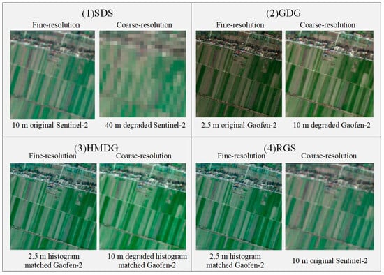 (4) RGS training samples for spatial super-resolution reconstruction. The fourth type of training samples is generated from real GF-2 and Sentinel-2 image pairs. However, one of the main challenges when working with datasets from different sources is image registration. Given that the spatial resolution of GF-2 is 2.5 m and the spatial resolution of Sentinel-2 is 10 m, the first step in the process is to generate histogram-matched GF-2 images to align the spectral characteristics of the two datasets. This ensures that the pixel intensity distributions of the two images are similar, making it easier to match the corresponding features. Next, due to the resolution difference between the GF-2 and Sentinel-2 images, image registration is performed to align the two datasets spatially. To achieve this, the registration process uses Automatic Robust Open Source Image Co-Registration Software (AROSICS) (version 2.0) [], which helps align the two images by calculating the geometric offsets between them. AROSICS software automatically identifies the corresponding features in both images and generates a matching grid of points. These points are used to correct the target image (GF-2) relative to the reference image (Sentinel-2), ensuring that both images are geometrically aligned. Once the GF-2 image is aligned with the Sentinel-2 image, the GF-2 image is used as the fine-resolution image, and the Sentinel-2 image serves as the coarse-resolution image for super-resolution model training. An example of the RGS training samples is shown in Figure 4(4).