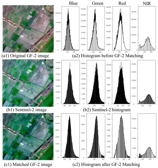 (3) HMDG training samples for spatial super-resolution reconstruction. The third type of training sample is specifically created to address the issue of differing spectral characteristics between GF-2 and Sentinel-2 images. Due to the different sensor characteristics and spectral responses of the GF-2 and Sentinel-2 sensors, pixel intensity values may not match even for similar surface features. To harmonize the spectral distributions between the two datasets, histogram matching techniques are applied to the GF-2 and Sentinel-2 images. GF-2-pixel value to a corresponding pixel value in the Sentinel-2 image, ensuring that the cumulative distributions of both images are as similar as possible. This mapping process is applied across all four spectral bands: blue, green, red, and near-infrared (NIR) []. As a result, the spectral characteristics of the GF-2 images are adjusted to match those of the Sentinel-2 images, reducing spectral differences between the two datasets. After histogram matching, the pixel intensity distributions across the spectral bands become more uniform, and the visual similarity between the images is significantly enhanced. The differences in pixel values across the blue, green, red, and NIR bands are minimized, making the spectral characteristics of the GF-2 images more comparable to those of the Sentinel-2 data. As shown in Figure 5, after histogram matching, the results indicate a more uniform distribution of pixel values across the bands, enhancing the visual similarity between the images. Once histogram matching is complete, the matched GF-2 images are downsampled by a factor of four, similar to the previous training sample types, resulting in 10-m resolution images. These images are then paired with their corresponding original 2.5-m resolution GF-2 images for use in training the super-resolution model. The matched spectral distributions help reduce the impact of spectral differences between the two datasets, allowing the model to focus on learning spatial features while minimizing confusion due to spectral misalignment. Using this matched result as training data for the super-resolution model allows for capturing spatial information while reducing spectral differences between different data sources, which helps improve the performance of image super-resolution. As a result, the super-resolution model can achieve better performance in terms of both spatial accuracy and spectral consistency, thereby improving the overall quality of the reconstructed fine-resolution images. An example of an HMDG training sample is shown in Figure 4(3).