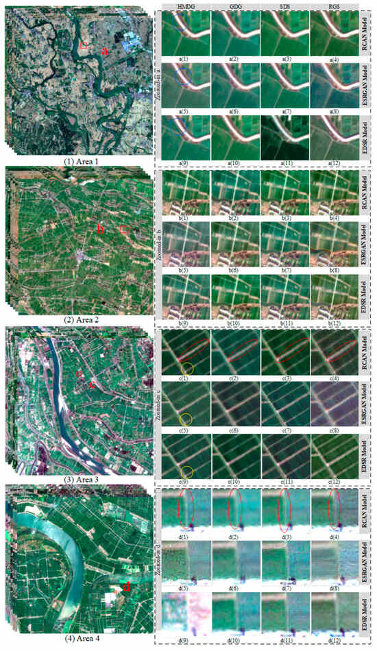 Super-resolution image reconstruction results. a(1)–a(12) are the image super-resolution reconstruction results of the RCAN, ESRGAN, and EDSR models using HMDG, GDG, SDS, and RGS training samples in area a. b(1)–b(12) are the image super-resolution reconstruction results of the RCAN, ESRGAN, and EDSR models using HMDG, GDG, SDS, and RGS training samples in area b. c(1)–c(12) are the image super-resolution reconstruction results of the RCAN, ESRGAN, and EDSR models using HMDG, GDG, SDS, and RGS training samples in area c. d(1)–d(12) are the image super-resolution reconstruction results of the RCAN, ESRGAN, and EDSR models using HMDG, GDG, SDS, and RGS training samples in area d.