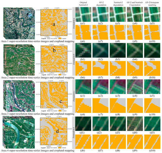 Super-resolution imagery and cropland mapping results using random forest classification. a(1)–a(5), b(1)–b(5), c(1)–c(5), and d(1)–d(5) show the original Sentinel-2 images for regions a, b, c, and d, as well as the super-resolution reconstruction results obtained using GDG, SDS, RGS, and HMDG training samples, respectively. a(6)–a(10), b(6)–b(10), c(6)–c(10), and d(6)–d(10) show the cropland mapping results obtained from the corresponding super-resolution images.