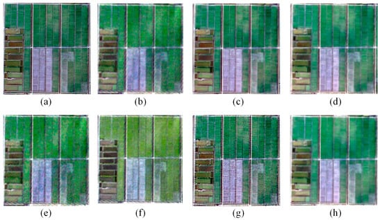 The super-resolution prediction results of models trained with HMDG and GDG on different input data. (a) is the histogram-matched GF-2 reference data, (b) is the Sentinel-2 data, (c) is the histogram-matched degraded GF-2 data, and (d) is the degraded GF-2 data. (e) is the super-resolution prediction result of (b) using the model trained with HMDG, (f) is the super-resolution prediction result of (b) using the model trained with GDG, (g) is the super-resolution prediction result of (c) using the model trained with HMDG, and (h) is the super-resolution prediction result of (d) using the model trained with GDG.