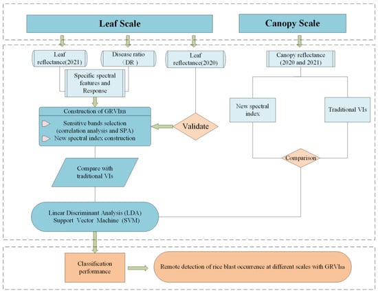 Therefore, the main goal of this study is to build a hyperspectral vegetation index specifically for rice blast, aimed at improving the monitoring and detection of the disease in rice crops at both the leaf and canopy scales. The aims of this study were (1) to explore the spectral response mechanism of rice leaf blast with different severity; (2) select the most sensitive bands for identifying healthy rice and infected rice; (3) propose a new vegetation index for discriminating rice blast-infected rice from healthy rice; and (4) to validate the capability of the new index in identifying rice blast disease and to apply it at different scales.