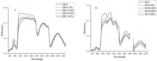 The impact of pathogen infection on reflectance in rice leaves (A) and canopies (B). (A) depicts the average spectral reflectance of leaf samples at varying levels of infection, (B) shows the mean reflectance of near-ground canopies.
