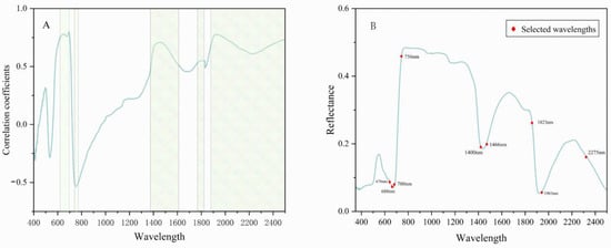 (A) Spectral reflectance and DR correlation coefficients. (B) SPA selected feature wavelength distribution.