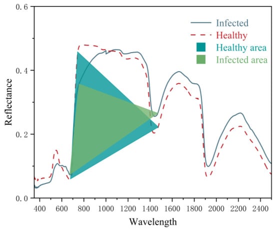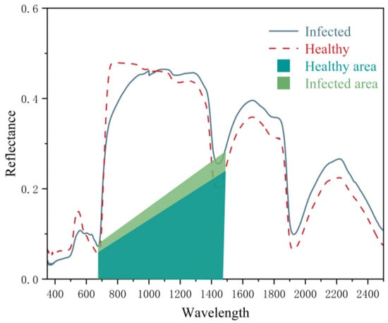 However, in the subsequent near-infrared to shortwave infrared range (900–2500 nm), reflectance showed an increasing trend. Based on the spectral response characteristics of rice blast disease, the disease could be identified by the differences in triangle area formed by the positions and reflectance of sensitive bands (688 nm, 756 nm, and 1466 nm). We found that the triangle area of the healthy sample was larger than that of the sample infected with rice blast disease (shown in Figure 4). The formula is as follows: