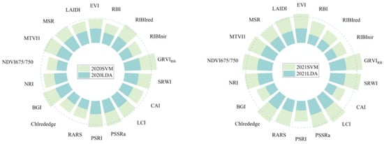 In order to investigate the application capability of the new vegetation index in identifying rice blast at the canopy scale, this study uses two years of canopy data for the analysis and calculates the classification accuracy of the new index and the traditional indices by using different methods. Figure 6 shows the overall performance of different indices in classifying infected and healthy samples at the canopy scale using different classification models in the 2020 and 2021 datasets. It can be seen that GRVIRB still has the highest classification accuracy, with 97.03% and 89.74% classification accuracy for the 2021 and 2020 datasets in the GRVIRB-SVM model, respectively. In the GRVIRB-LDA model, the classification accuracy for the 2021 and 2020 datasets was 97.03% and 85.9%, respectively. Overall, the accuracy of the GRVIRB-SVM model is superior to that of the GRVIRB-LDA model. While RIBIred showed strong performance at the leaf scale, its effectiveness at the canopy scale was less satisfactory. On the contrary, SRWI did not have a high classification accuracy at the leaf scale but showed good classification performance at the canopy scale, which may be due to the significant reduction in canopy vegetation water content after rice was stressed by the disease, so the SRWI index was more sensitive at the canopy scale than it was at the leaf scale. Other vegetation indices with good potential at the leaf scale, such as MSR, EVI, and PSSRa, still did not perform as well as GRVIRB. This further suggests that GRVIRB has significant sensitivity for detecting rice blast and can better characterize the disease.