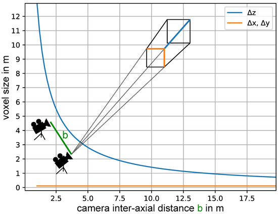 Projected voxel size in 130 m: and are the projected voxel lengths in the image plane, is the voxel length in the depth direction, b is the camera inter-axial distance, the focal length is 20 mm and the sensor pixel size is 17 μm. The derivation can be found in Appendix A.